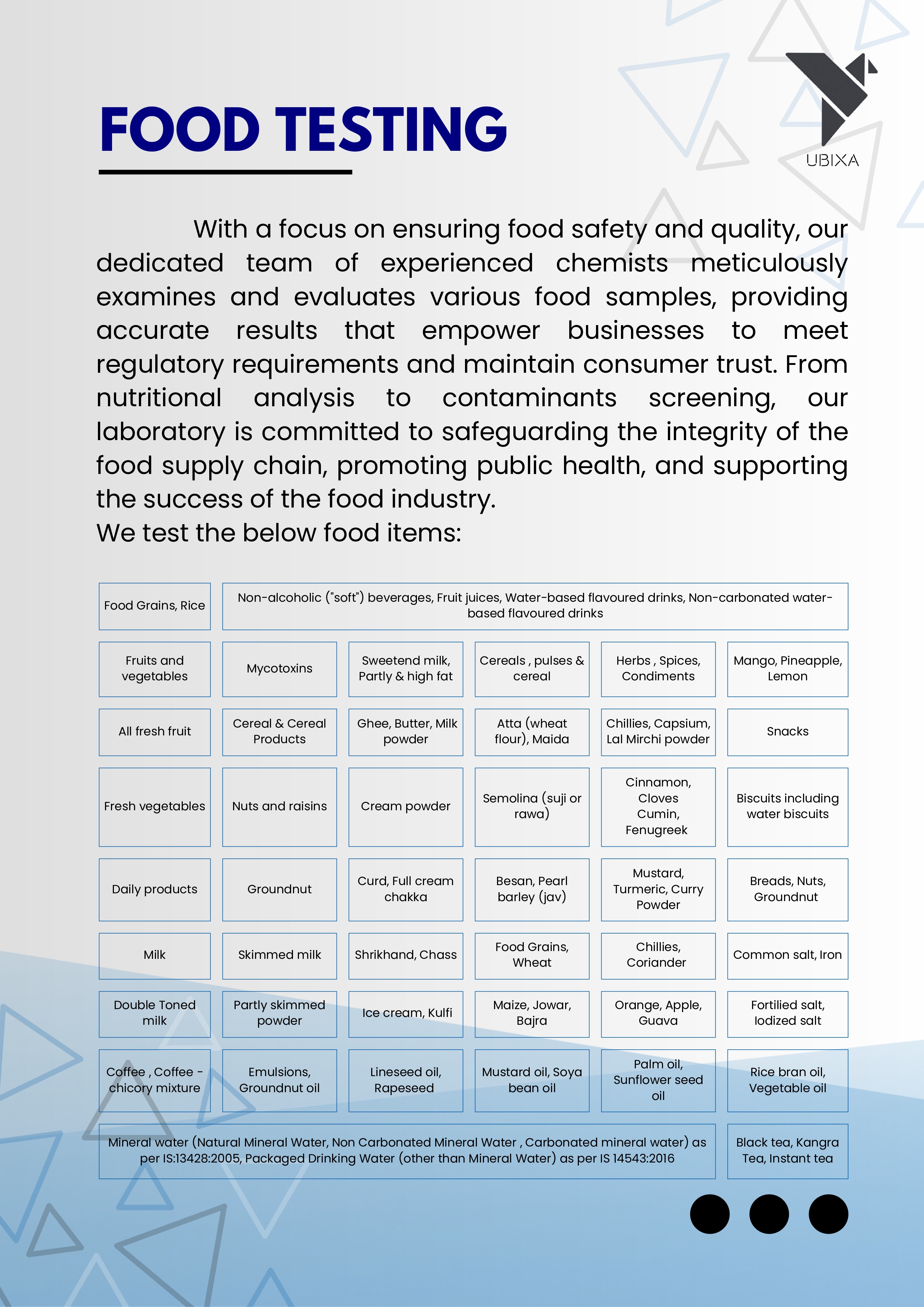 With a focus on ensuring food safety and quality, our dedicated team of experienced chemists meticulously examines and evaluates various food samples, providing accurate results that empower businesses to meet regulatory requirements and maintain consumer trust. From nutritional analysis to contaminants screening, our laboratory is committed to safeguarding the integrity of the food supply chain, promoting public health, and supporting the success of the food industry. We test the given food items: