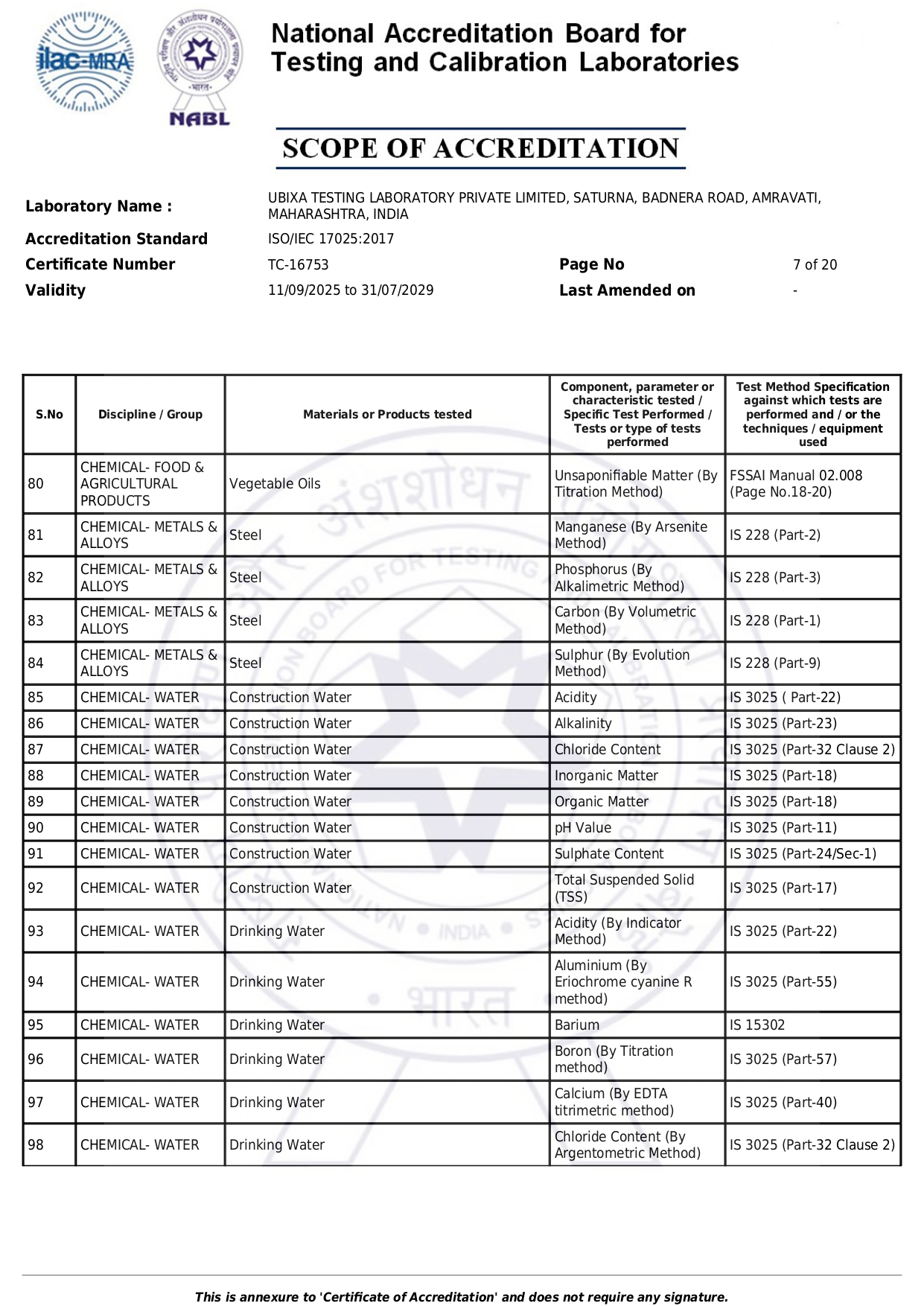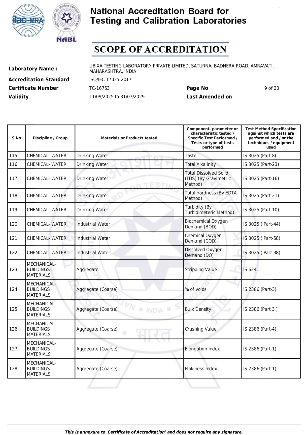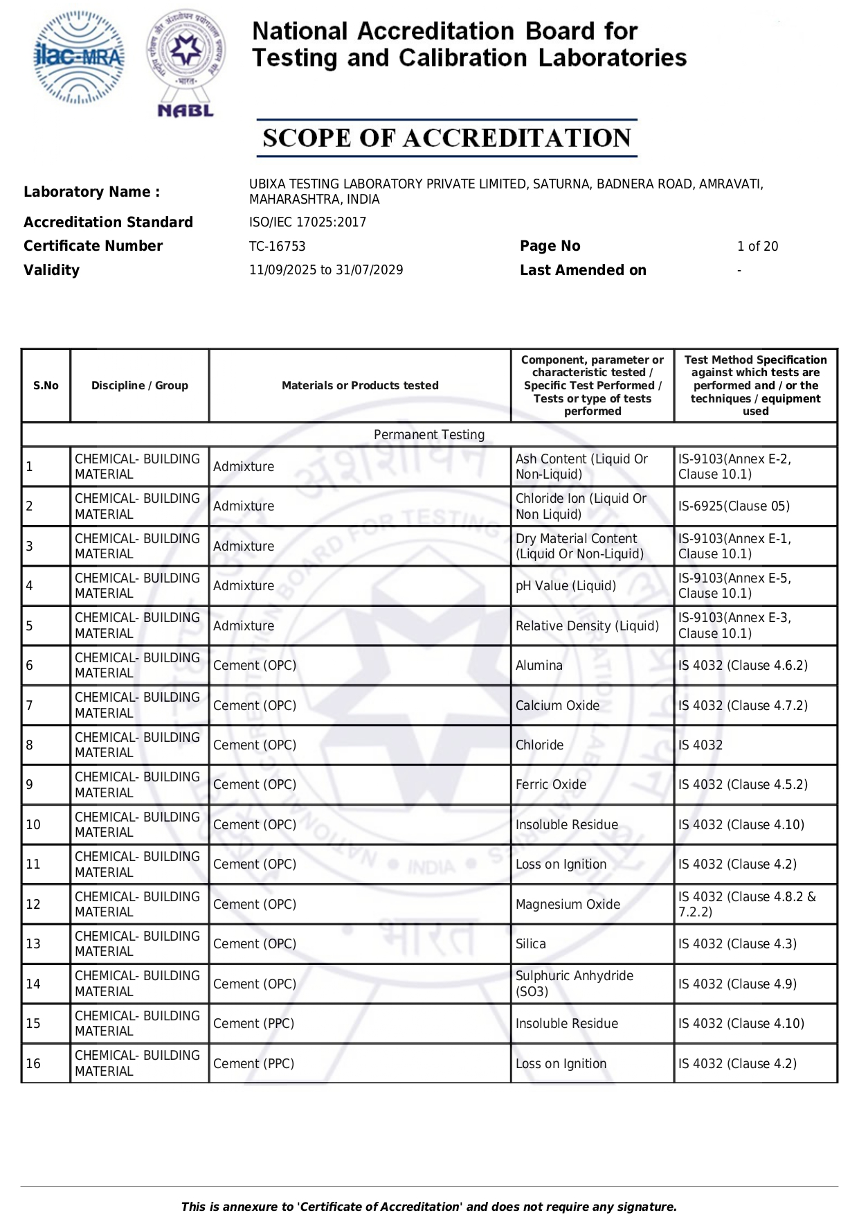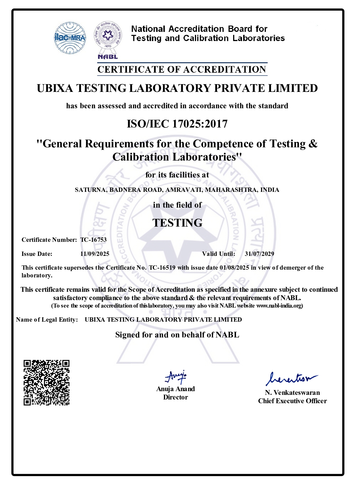 UBIXA (Testing Laboratory) is NABL Accredited renowned amongst customers for its prompt, dependable, and trustworthy testing services for over 250+ physical and chemical testing parameters. The laboratory covers a comprehensive range of tests, such as: